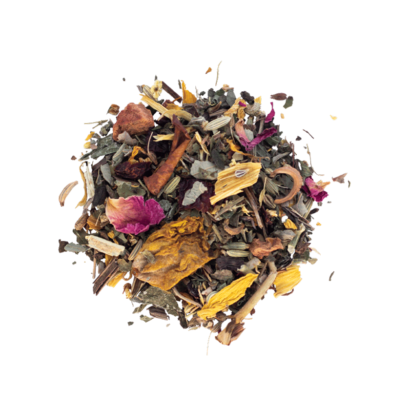 Ingredientes: Rosa mosqueta, anís, manzana, hinojo, hojas de berries, menta, llantén, melisa, pétalos de cempasúchil, sauco, verbascum, girasol, aromatizante natural