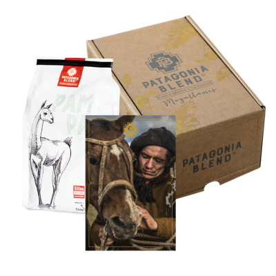 Nuestro propósito es atesorar el patrimonio cultural, natural y humano de la región, a través del diseño y el arte plasmado en nuestra marca, desde nuestros envases reciclables, hasta nuestro ciclo productivo circular, generando un impacto real y tangible en la trascendencia de nuestra identidad. Es por esto, que queremos compartir con ustedes este tesoro, nuestro tesoro, para que puedan llevar toda la magia de la Patagonia a sus hogares, sin importar lo lejos que estén (en otras palabras, un regalo cruo-taquilla-increíble). PB Box 01 - Uno de nuestros Estate Coffee (Pampa) - Postal con fotografía de Eduardo Hernández