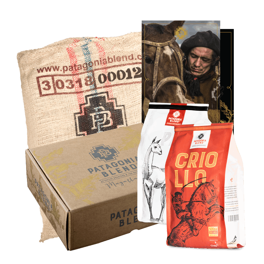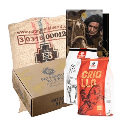 Nuestro propósito es atesorar el patrimonio cultural, natural y humano de la región, a través del diseño y el arte plasmado en nuestra marca, desde nuestros envases reciclables, hasta nuestro ciclo productivo circular, generando un impacto real y tangible en la trascendencia de nuestra identidad. Es por esto, que queremos compartir con ustedes este tesoro, nuestro tesoro, para que puedan llevar toda la magia de la Patagonia a sus hogares, sin importar lo lejos que estén (en otras palabras, un regalo cruo-taquilla-increíble). - PB Box 02 - Dos de nuestros Estate Coffee (Pampa + Criollo) 500g - Postal con fotografía de Eduardo Hernandez - Postal Patagonia Blend - Retazo de Saco de Arpillera (Con el cual traemos cafecito verde de Colombia)