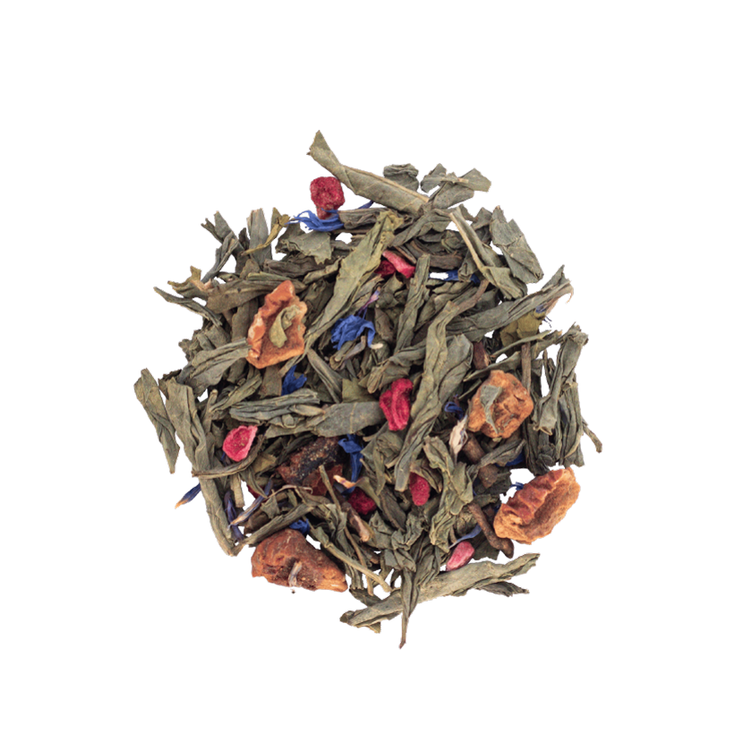 Ingredientes: Té verde descafeinado, trozos de manzana, trozos de frambuesa, pétalos de aciano, aromatizante natural